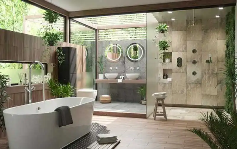 Để góp phần thanh lọc không khí, mang lại cảm giác xanh tươi, thoải mái thì một số gia đình thường sẽ đặt chậu cây xanh trong nhà vệ sinh. Mặc dù việc phân chia không gian nhà vệ sinh và nhà tắm riêng sẽ làm không gian thêm phần tươi mát, hòa hợp với thiên nhiên nhưng sẽ chỉ phù hợp với diện tích vừa phải, không quá rộng cũng không quá chật. Đồng thời, để tạo được điểm nhấn, gia chủ nên ưu tiên bài trí toilet với gam màu trắng hoặc nâu.